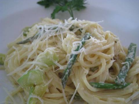 Špagete uobičajno skuhati, šparoge očistiti, oprati i otkinuti tvrde donje dijelove.Rezati na oko 10 cm dužine.Tikvice oprati i isjeći na ploškice.