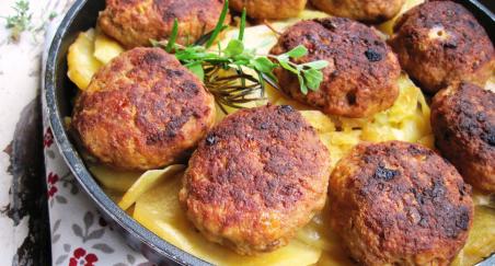 praviti polpete i pržiti ih u vrućem ulju...kada su dobili koricu s obje strane izvaditi ih i ostaviti na toplome, na istom ulju popržiti luk, malo ga posoliti, poklopiti tavu i ostaviti na tihoj vatri da luk omekša. U vatrostalnu posudu na dno rasporediti luk, preko njega krumpir, posoliti ga i popapriti...po površini složiti ispržene polpete, listiće ružmarina i lovorov list..sve zaliti pivom i vodom, prekriti aluminijskom folijom.