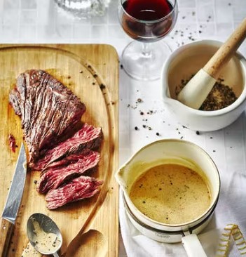 Deglazirajte konjakom , flambirajte (po želji) i pustite da se umak smanji na pola pa dodajte teleći temeljac . Pustite da prokuha pa smanjite umak na pola i završite dodavanjem tekućeg vrhnja. Posolite i provjerite glatkoću. Umak možete procijediti da uklonite velike komade papra.