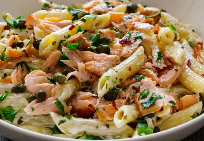 7. Poslužite svježu tjesteninu od lososa odmah dok je vruća! Završite posipanjem ribanim parmezanom i posipanjem s nekoliko kapara