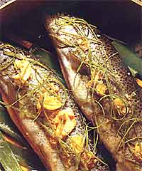 Ukloniti beli luk iz tiganja i staviti pastrmke. Prziti 4-5 minuta, posuti limunovom korom, persunom i zacinima. Skloniti sa sporeta i ostaviti na toplom mestu.