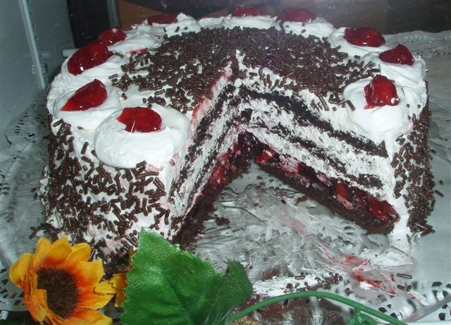 Izrendati 2 kasike cokolade a ostatak istopiti.mesati maslac sa obe vrste secera. Pomesati brasno i gustin sa bademima i praskom za pecivo.maslacu dodati zumanca tecnu cokoladu, smesu brasna i sneg od belanaca.Testo ispeci i iseci na dva do tri dela.natopiti ih visnjevacom.Visnje kuvati u pola litre vode 7 min i iscediti. Zelatin otopiti. Umutiti pavlaku i sa pavlakom spojiti zelatin.Visnje rasporediti po korama i prekriti ih sapavlakom.Spolja ukrasiti sa pavlakom i rendanom cokoladom.