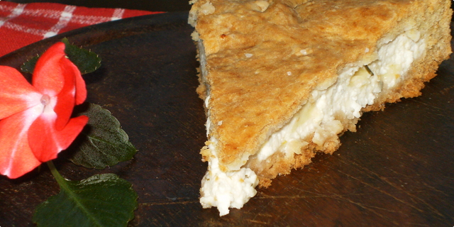 4 Izvadite testo iz rerne sipati fil, dobro ga kašikom rasporedite po celoj piti. Sada razvući i manji deo testa i njime zatvorite pitu. Možete i gornju koru malo izbockati viljuškom.