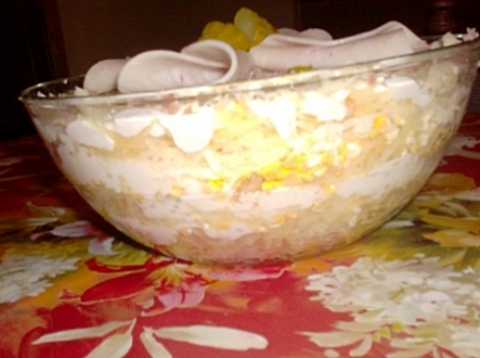 Skuvati odprilike 3 srednja krompira i izrendati na krupnije rende. Izrendani krompir rasporediti po ciniji u kojoj ce se nalaziti salata tako da prekrije dno i stranice cinije. Kada smo to uradili krompir posoliti i pobiberiti po ukusu.Preko krompira staviti odprilike 2 srednje kesice majoneza, preko toga staviti oko 200 g sunke sitno seckane i to malo posoliti i pobiberiti.