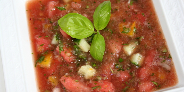 3 Staviti u blender 750 ml smese pa sve to smrviti, sipati u posudu, u kojoj cete posluziti gazpacho, uzeti jos 750 ml smrviti i to, sipati u posudu, pa ostatak lubenice sipati u smrvljenu smesu, dobro promesati i ostaviti da se ohladi.