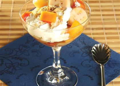 U većoj posudi izmešati tropsko voće sa žutim šećerom i preliti rumom.Servirati u porcije i dekorisati