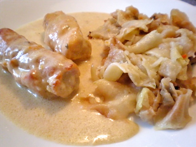 Izvaditi rolice na stranu, dodati na masnoću od pečenja vino, kratko prokuhati, doliti vodu i kiselo vrhnje,začiniti i pustiti da zakuha.