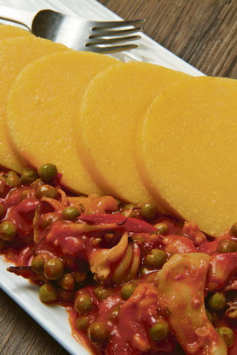 4 Kuhajte još pola sata bez poklopca, dok sipa ne omekša. Isprobajte vilicom. Kada je gotovo, umak bi trebao biti prilično gust. Kukuruznu krupicu skuhajte u slanoj vodi pa je izlijte u vodom navlaženi kalup. Kada se stvrdne, narežite je na šnite.