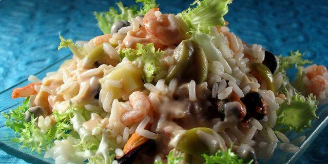 1 Račiće i očišćene dagnje stavite u kipuću i malo posoljenu vodu. Kratko ih prokuhajte i ocijedite.2 Rižu skuhajte u blago posoljenoj vodi, ocijedite, malo isperite pod mlazom vode i stavite u dublju zdjelu.