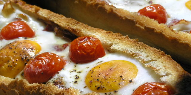 Sada u peciva stavimo prvo mocarelu,na nju prepečenu slaninu,na slaninu razbijemo jaje tako da žumanjak ostane cijeli i na kraju dodami prerezane rajčice.