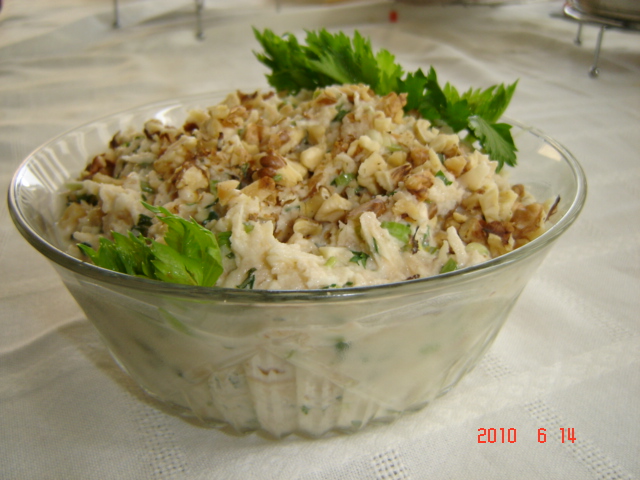 3 nakisele jabuke, manja glavica celera, 3-4 stabljike celera, nekoliko listova celera, po 3 pune kasike majoneza i kisele pavlake, malo soli, sok od 1 limuna, 80 gr jezgra oraha i malo sjeckanog lista persuna.