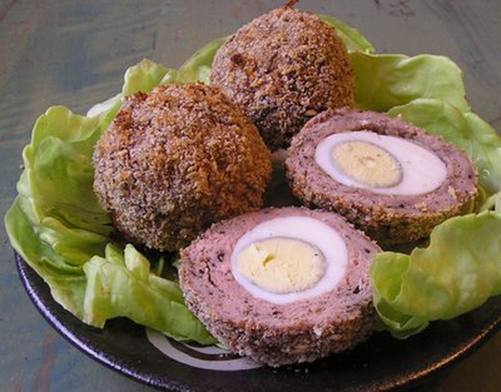 Svako kuvano jaje omotati pogačicom od mesa, uvaljati ih u brašno i peći na vrelom ulju.