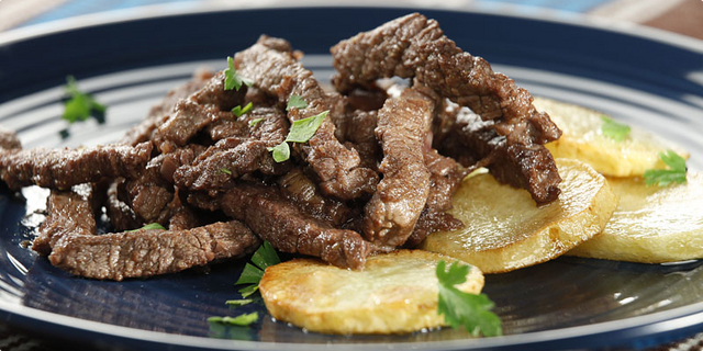 1 Biftek narežite na tanje rezance, posolite, popaprite i pustite da odstoji 30 minuta.