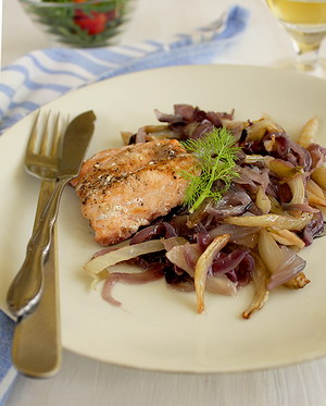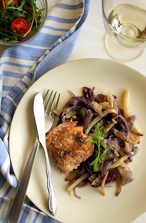 Kada su luk i komorač gotovi, skolonite ih u stranu pleha, stavite losos u sredinu, poprskajte ga sa maslinovim uljem, i na kraju sve prelijte belim vinom.