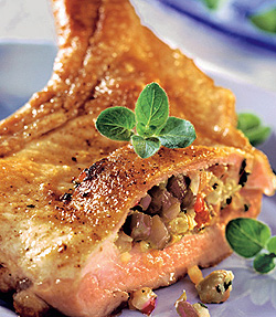 2. Istanjiti fi lete, popreko zaseci dzepove na mesu, napuniti ih pripremljenom mesavinom i zatvoriti cacka licama.