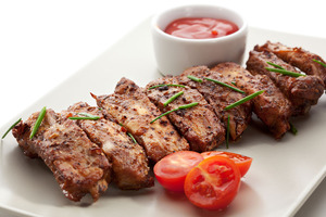 2 kg svinjskih rebaraca (prednji ili zadnji deo grudnog koša), 1 glavica crnog luka, 2 kašike svinjske masti, 4 kašike kečapa, 2 kašike sirćeta, 4 kašike limunovog soka, (po ukusu), 2 kašike šećera ili još bolje meda (blagog ukusa), 2 kašičice senfa, 1 kašičica sušenog bosiljka, 1/2 kašičice čilija, 1 kašičica soli ili vegete malo više, 1/2 kašičice bibera