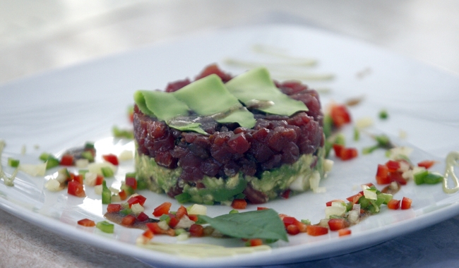 Pripremiti vinegret sos za prelivanje tatara od tune. Pomešati ojster sos, luk vlašac, čeri sirće i maslinovo ulje. U kalup prvo dodati gvakamoli, preko staviti iseckanu tunu i listove avokada. Skloniti kalup i jelo preliti vinegret sosom. U tanjir dodati iseckani miks zelene, žute i crvene paprike. Sipati oko jela vasabi i staviti listove bosiljka.