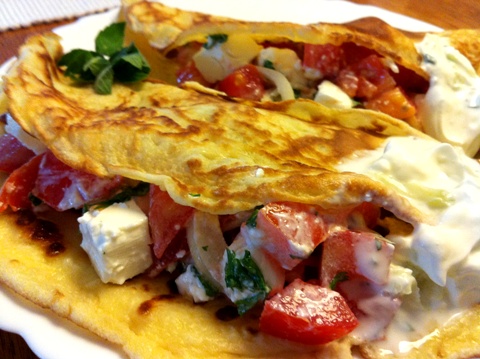 Punite ih sa salatom od rajčice i prelijte zazikijem. Ukrasite sa krastavcem i mentom.
