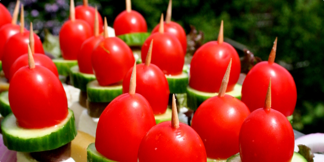 4 Na sir staviti kolut maslinke, na nju staviti kruzic krastavca, cackalicom ubosti paradajz po sredini i onda probosti sve ostalo, nezno podici i staviti na tacnu sa koje cete posluziti.