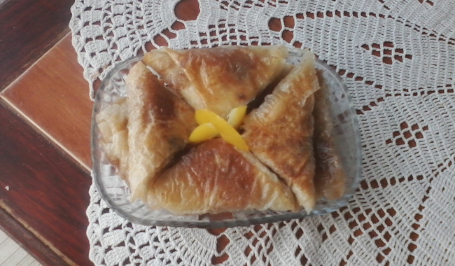 Pomešati mlevene orahe, suvo grožđe i 2 kesice vanilin šećera u jednu činiju. Kore poredjati jednu na drugu pa ih iseći na pet jednakih traka. Fil nanositi do polovine jedne trake.Podići desnu ivicu trake sa filom prebaciti je na levu stranu. Dobijeni trougao saviti po gornjoj ivici prema gore. I novi trougao saviti prema gore. Ponavljati savijanje do kraja trake. Redjati u bogato nauljenu tepsiju. Baklave preliti sa 2 dl ulja.