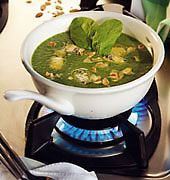 2 veca bataka ili parce teletine,3 sargarepe,veci crni luk,pola stap prazi luka,1 cen belog,400g spanaca,krompir,malo bibera,vegeta po ukusu.