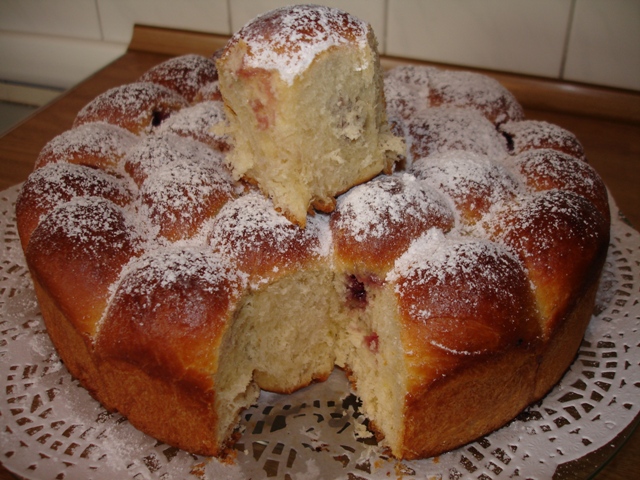 U mlako mleko rastopiti kvasac, pa ga sa brasnom lagano zamesiti, povrsinu posuti brasnom, pokritii staviti na toplo da se dize. Preostalo brasno i secer u prahu spojiti, razmutiti maslac, jaja i zumance. Kad se na povrsini pokazu grube pukotine, dodati kvascu sve pteostale sastojke umesiti glatko testo, staviti da se dize pola sata. Ugrejati rernu na 200 C.