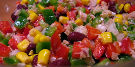 3 Luk i papriku nasjeckajte na sitne komadiće i pomiješajte s prethodno navedenim sastojcima. Sve začinite solju, paprom, chillijem u prahu, maslinovim uljem . Pokapajte limunovim sokom.