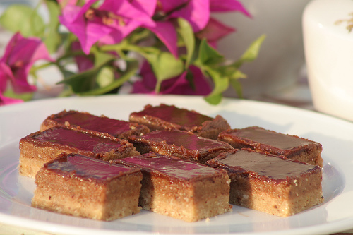 Kada se prohladi dodati keks, orahe i sok od pomorandže pa izliti u plitku posudu (pleh iz rerne npr.) i poravnati.
