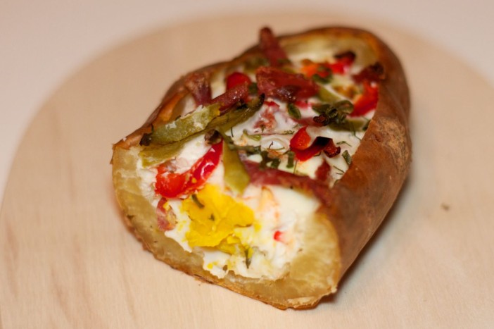 U tu “lađicu” od krumpira lupite jedno do dva jaja, ovisno o veličini krumpira, posolite ih te na kraju posipajte špekom i povrćem.