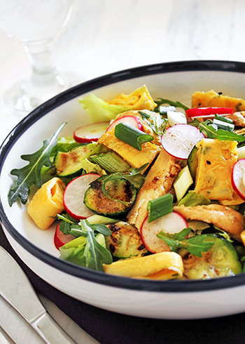 Rasporedite salatu na tanjire pa poređajte omlet, tikvice i ribu.