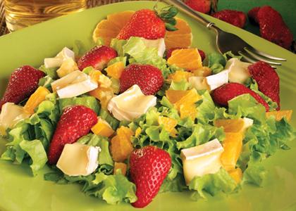 Zelenu salatu iseckati i servirati na tanjir, dodati polovine jagoda, komadiće pomorandže i kockice kamember sira.