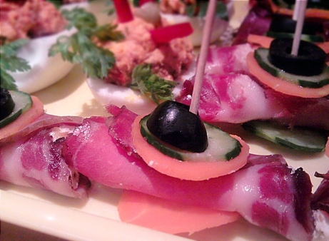 Na gornji deo staviti kolutove krastavca, šargarepe ili nečeg drugog po izboru, pa probosti čackalicom.