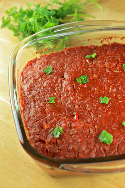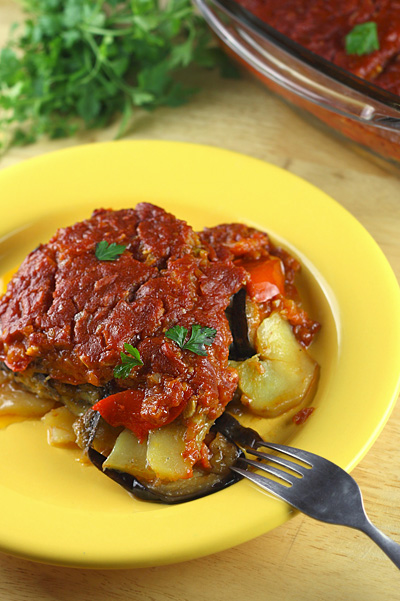 3. U posudi sa debelim dnom na srednjoj temperaturi ugrejati 200 ml ulja pa propržiti krompir, u dve ture, bez mešanja, po 8-10 minuta, tj. toliko da krompir postane mekan ali da ne dobije boju. Ocediti od ulja i poredjati ga na dno vatrostalne činije, posoliti. Na istom ulju propržiti kolutove plavog patlidžana, u dve ture, dok patlidžan ne omekša. Ocediti od ulja pa poredjati preko krompira, posuti sa malo soli i bibera. Na istom ulju propržiti papriku, 15-ak minuta, dok ne omekša, pa ocediti i poredjati preko patlidžana. Sve preliti paradajz sosom i staviti u rernu na pola sata, da se zapeče. Pred služenje posuti svežim peršunom.