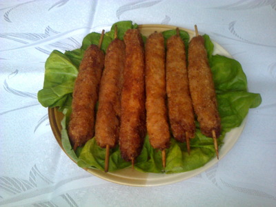 Od dobijene mase napraviti štapiće i staviti ih na štapiće za ražnjiće, svaki uvaljati u brašno, pa u ulupana belanca i na kraju u prezle.