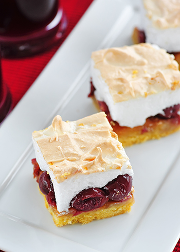 Izvadite pečeno testo iz rerne, rasporedite višnje, a zatim premažite pripremljenim šaumom.
