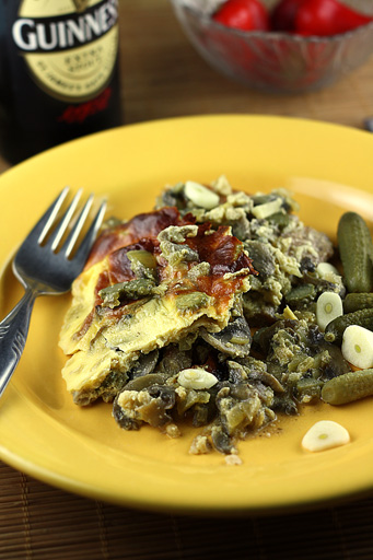Izmešati 3 jaja i čašu pavlake i preliti preko, pa peći oko 30-45 minuta na 200°C.