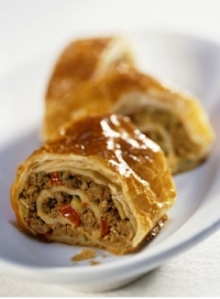 Uzeti četiri kore za pitu, pa prve tri pomoću kuhinjske četkice premazati filom od kvasca a na četvrtu rasporediti malo nadjeva od mljevenog mesa i urolovati.