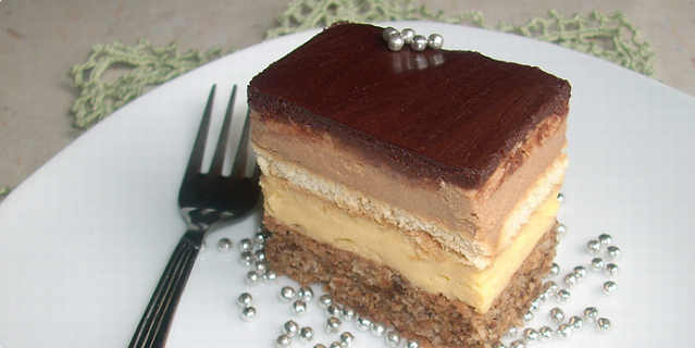 2 Za kremu u malo toplog mlijeka pjenasto umutiti žumanca sa šećerom, pudingom i brašnom, zakuhati u preostalo mlijeko. U toplu kremu umiješati maslac, miješati dok se ne rastopi. U polovicu kreme umiješati istopljenu mliječnu čokoladu, u drugu polovicu umiješati istopljenu bijelu čokoladu. Čvrsto istući slatko vrhnje (po potrebi dodati šlagfix), te u svaku polovicu ohlađene kreme umiješati po pola količine tučenog vrhnja.