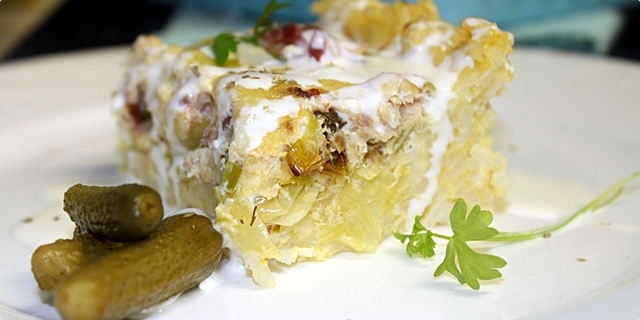 6 Na smjesu riže posložite pirjani poriluk, a na njega izlijte preostalu smjesu s ribom,te vrhnje za kuhanje