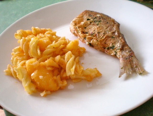 Kao prilog uz ribu možete poslužiti blitvu s krumpirom na lešo, restani krumpir, pommes frittes ili tijesto s krumpirom kao što sam ja danas.