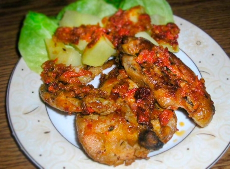 Na ulju upržiti beli luk sitno iseckan pa dodati posoljene komade piletine.Propržiti ih sa svih strana pa naliti sa malo vode.