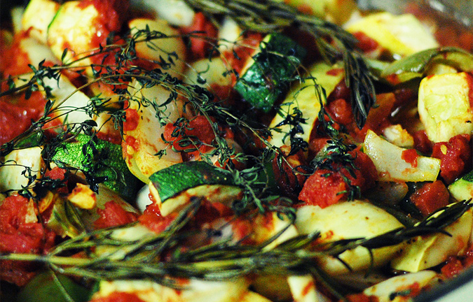 Zatim propržite sitno seckani crni i beli luk, pa dodajte krupno sečen paradajz, posolite i stavite ostale začine (lorber, biber, timijan, ruzmarin, origano, lavandu, biber, so). Dinstajte par minuta na tihoj vatri bez poklopca, pažljivo umešajte tikvice i papriku, a posle desetak minuta i krastavac, i pržite još desetak minuta. Pre serviranja pospite s malo timijana.