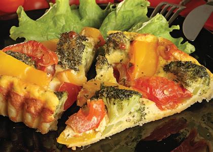 Lisnato testo rastanjiti oklagijom i njime obložiti odgovarajuću tepsiju.Paradajz i papriku iseći na kriške i zajedno sa obarenim cvetovima brokolija rasporediti po testu.