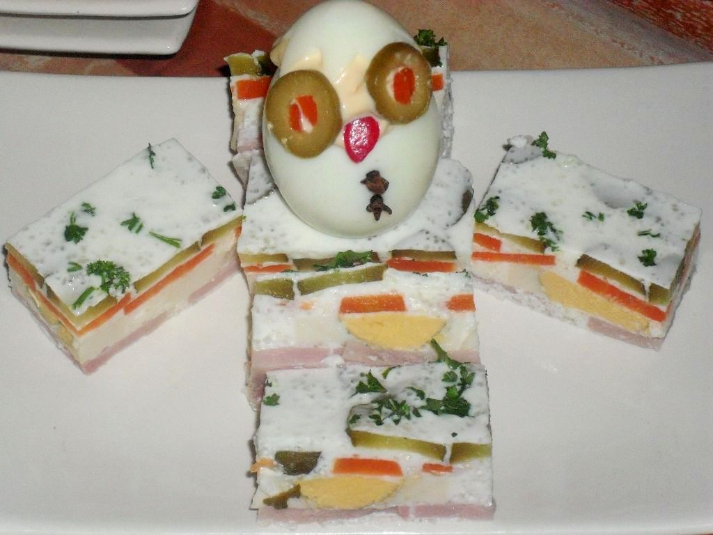 Jogurt stavit na ringlu, ugrejati da bude vruć, sipati želatin, majonez, dobro izmešati. Želatin prethodno pripremiti po upustvu na kesici.Skinuti sa ringle, izliti u četvrtast kalup 2 kutlače bele smese, staviti ceo red šunke, opet malo bele smese, pa jaja, bela smesa, šargarepa, bela smesa, krastavčići, bela smesa i ostaviti da se ohladi!