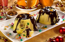 Puding izvadite iz rerne, sačekajte da se ohladi, preručite na tanjire za posluženje i ukrasite prelivom od čokolade.