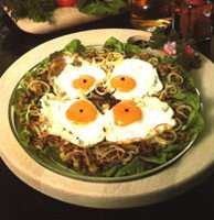 Kada je masa dovoljno zagrijana, izlije se jaje «na oko», malo posoli i zapeče. Pobiberiti, posuti alevom paprikom i dodati po zrno bibera na izliveno žumance. Servirati toplo.