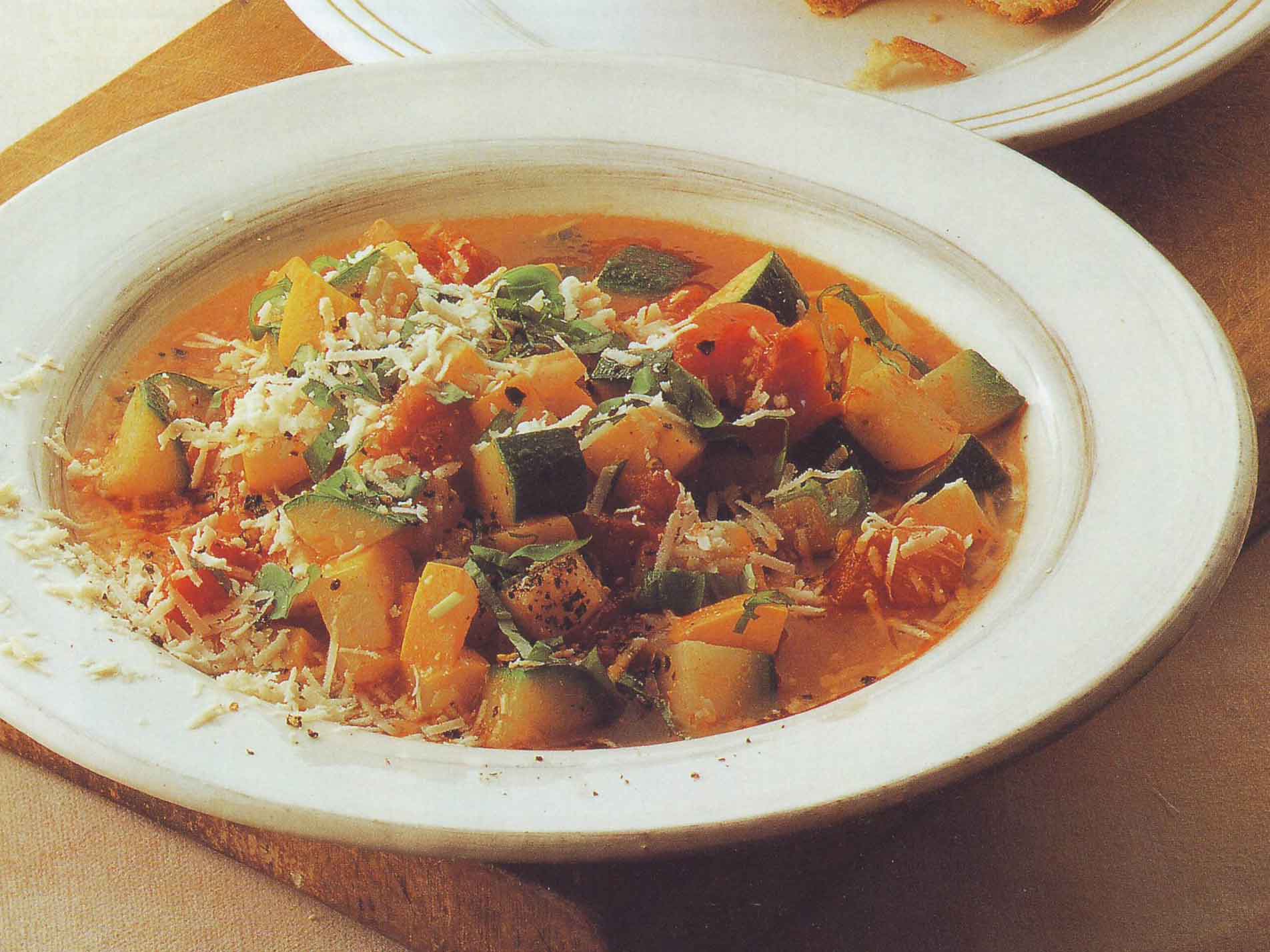 Zagrejte ulje u velikom tiganju, dodajte crni luk i propržite lagano dok ne omekša, oko 5 minuta, mešajući povremeno. Dodajte pastu sušenog paradajza, seckani paradajz, tikvice, seckani krompir i beli luk.Promešajte dobro i kuvajte još 10 minuta, bez poklapanja drmusajući tiganj s vremena na vreme da se povrće ne zalepi za dno.