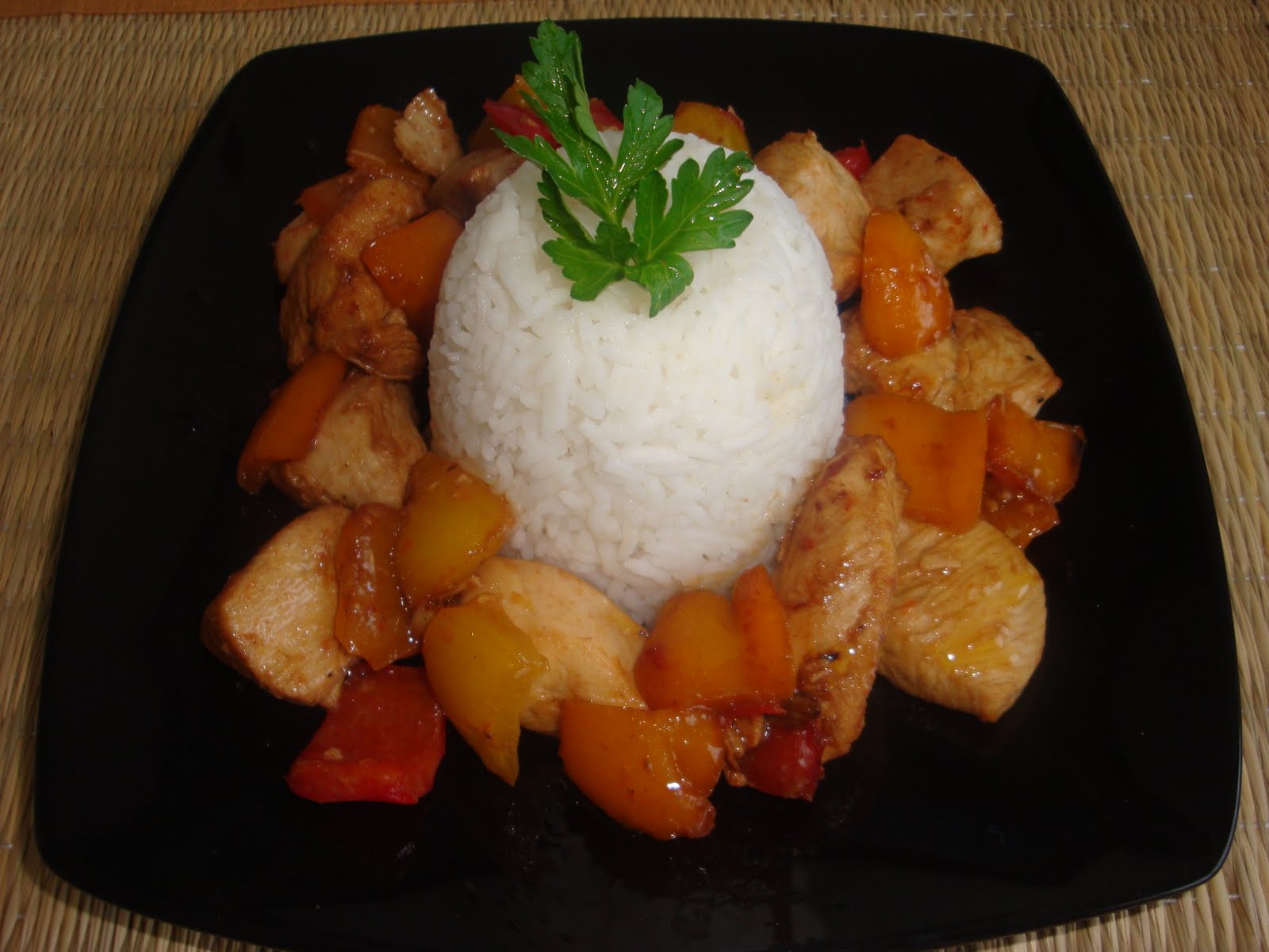 Paprike iseci na kockice. U zagrejan tiganj u koji ne treba da se stavi vise nikakva masnoca, istresti meso sa marinadom, dinstati oko desetak minuta, pojacati temperatuiru, dodati papriku, posoliti i pobiberiti i peci sve zajedno jos oko deset minuta, mesajuci.