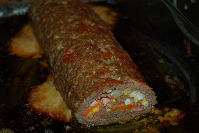 Prethodno samleti na masini za meso 150gr sunke pa je sad posuti po jajima. Zaliti sa 3 kasike kisele pavlake. Zatim od mesa zaviti rolnu. Namazati sud dobro maslom, rolat metnuti u sud i staviti ga da se u pecnici pece.