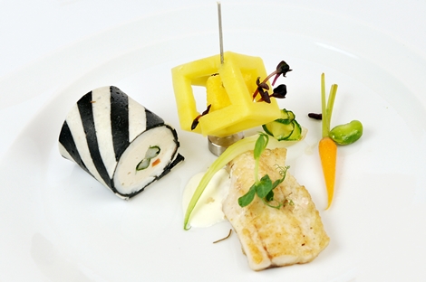 Od sitnog mesa, vrhnja i začina napravite smjesu kojom punite roladu i od koje radite panadu (omot) za roladu (u pola smjese za panadu dodajte crnilo od sipe). Roladu punite gamberima omotanim u bosiljak i smjesom od brancina te ju omotajte crno-bijelom panadom i skuhajte u temeljcu.